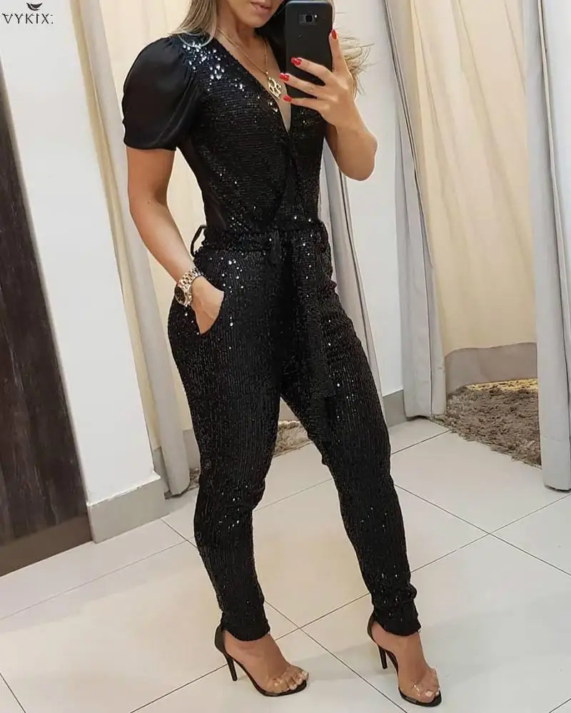 Fashion Skinny Sexy Jumpsuit Women Romper V Neck Short Sleeve Sequin Solid Color Night Clubwear One
