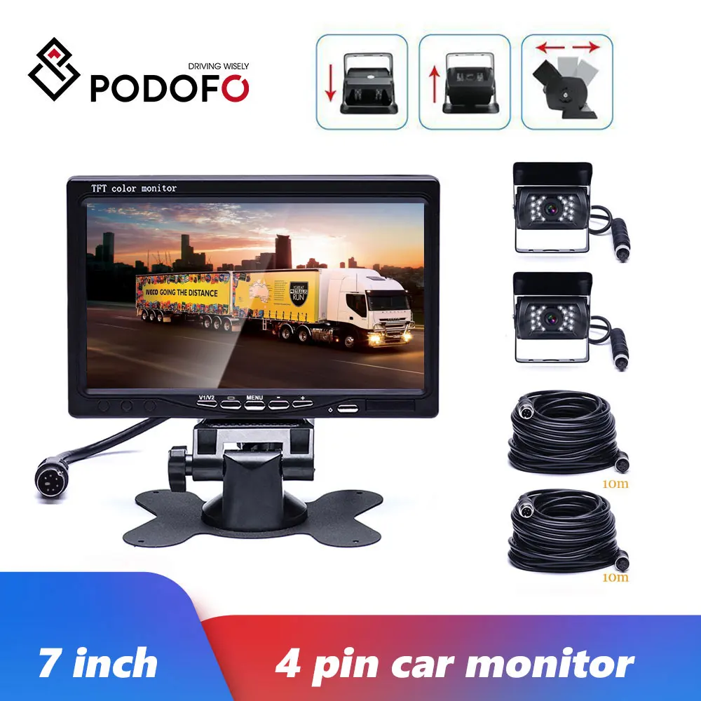 BEST QUALITY Podofo 7 inch 12V-24V TFT LCD Car Monitor Rear View Display Waterproof 4pin IR Night Vision Reversi